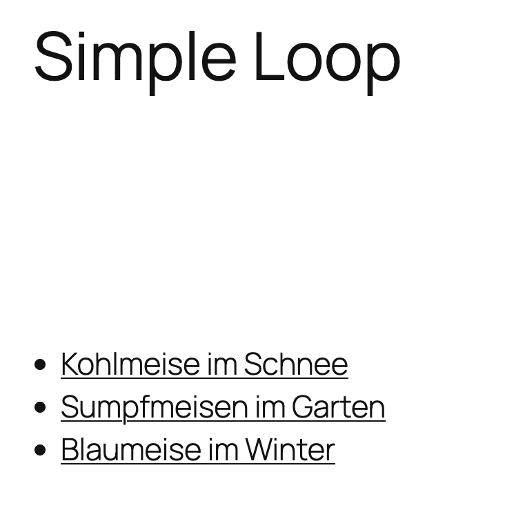 Der Begriff loop definiert, dass eine Schleife ausgeführt werden soll, und zwar mit den Parametern {query:posts}. Diese Schleife wird nun in den Eckigen Klammern ausgegeben [ … ]. Innerhalb der Schleife finden wir die beiden Shortcodes {post:permalink} und {post:title}. Der Rest ist HTML.