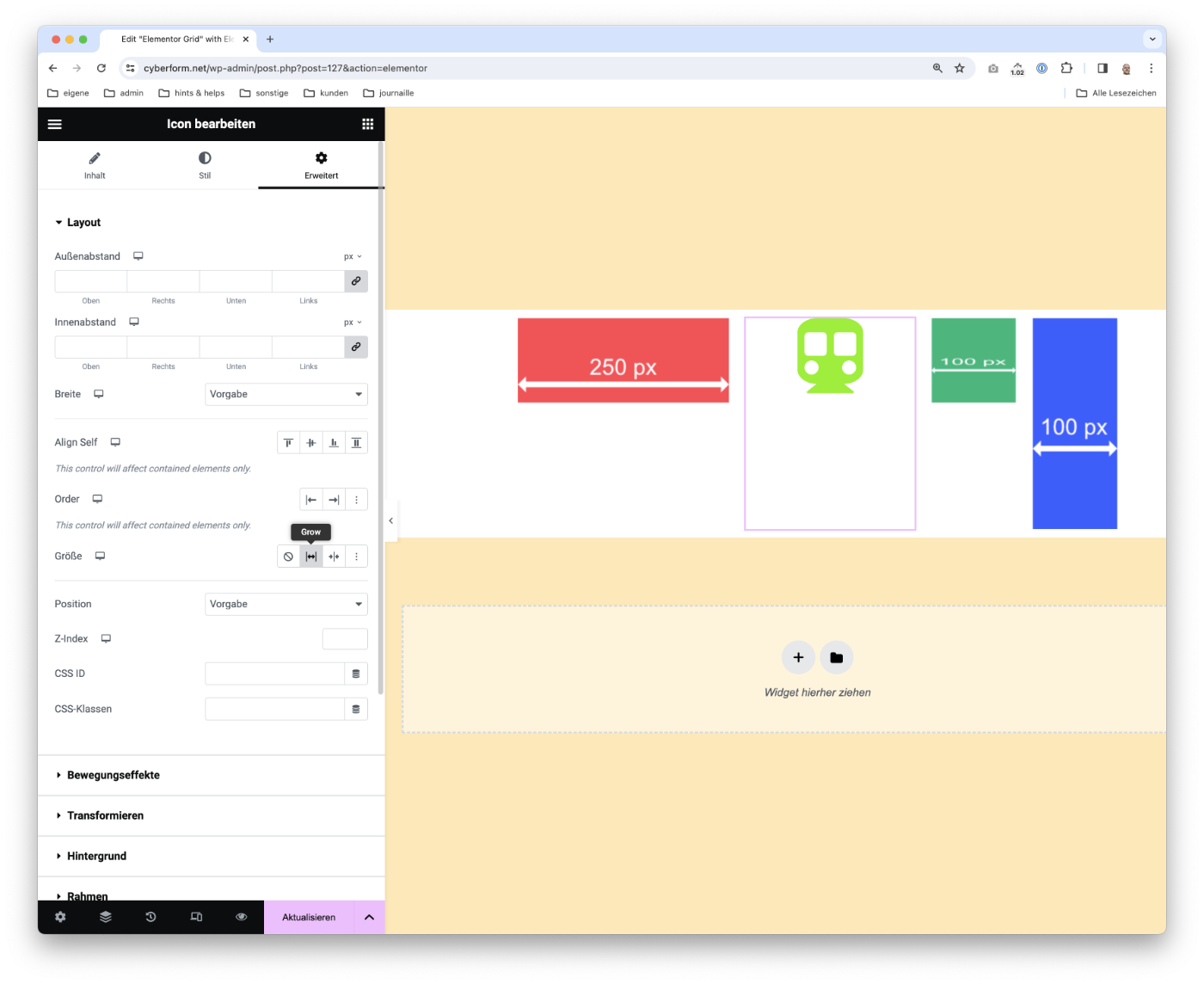 Größe (Size). Manchmal will man die Größe eines Elementes so ändern, dass es einfach „den Rest des Platzes“ einnimmt. Genau das bewirkt die Einstellung Grow (auch grow to fit genannt). Shrink wiederrum macht das Gegenteil, es miminiert die Größe auf das mögliche Minimum. Die Individuellen Einstellungen ermöglichen Flex Grow bzw. Flex Shrink. Ein Beispiel auch hier.