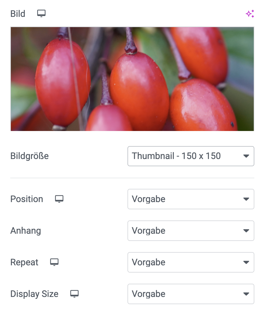Die Bildauswahl funktioniert gleich wie beim Widget Bild gewohnt. Das Bild selber, die Position, Wiederholung ud